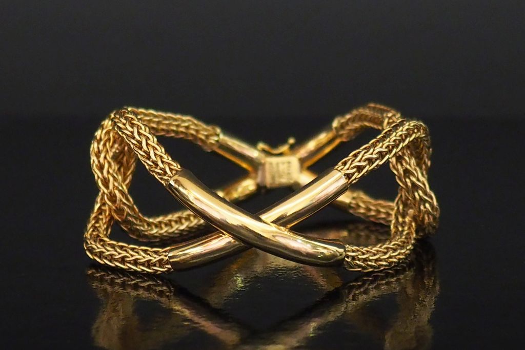 SPITZER FUHRMANN Large bracelet ajouré en or jaune, maille ronde tressée, à décor de deux croisillons en plein. Signé. Long. 20 cm Larg. 3 cm Poids. 90 g