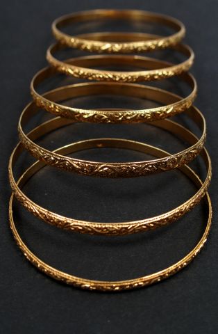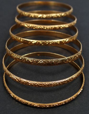 Suite de 6 bracelets en or jaune, à décor gravé de volutes. Poids : 84 gr