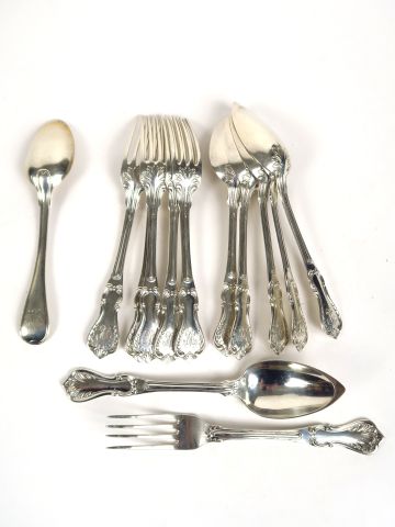 Suite de 6 couverts à entremets de style Rocaille en argent, poinçon Minerve. Monogrammés. On y joint une cuillère dépareillée. Poids : 604 g