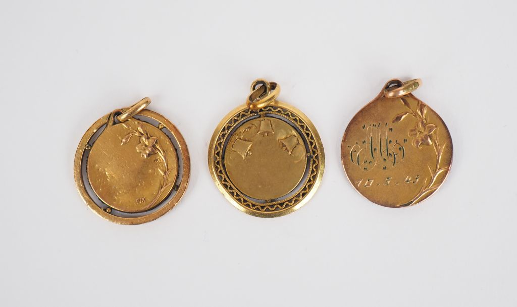 Trois différentes médailles en or jaune. Poids. 5,80 g