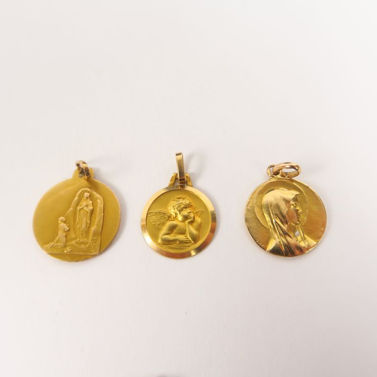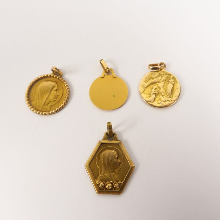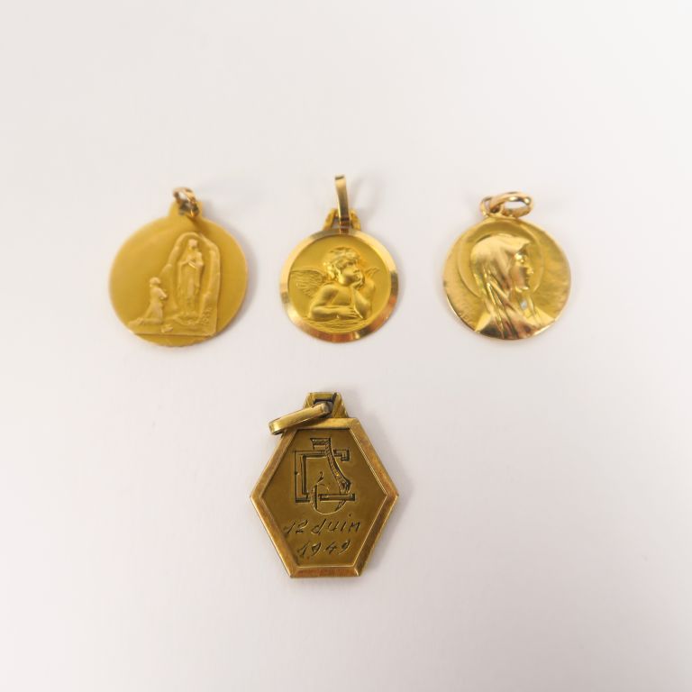 Trois médailles en or et une médaille en métal. Poids. 5 g