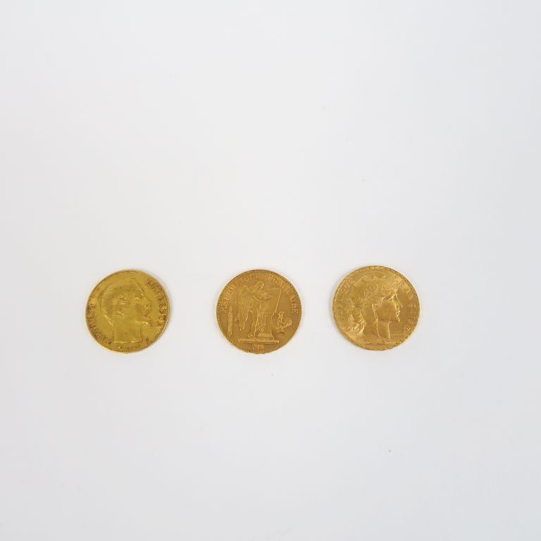 Trois pièces de 20 Francs or, 1859, 1896-A et 1907. FRAIS ACHETEURS : 5% TTC