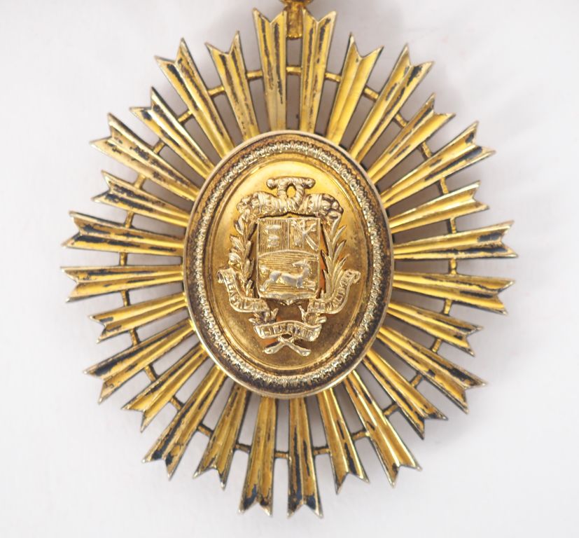 VÉNÉZUELA ORDRE DU LIBÉRATEUR SIMON BOLIVAR (1880) Etoile de commandeur de Dieudonné Costes. En vermeil et émail. Centre en plusieurs parties. Cravate. Dim.5.5 x 5 cm. Poids brut : 29 g T.T.B. Provenance : -Vente des souvenirs de Dieudonné COSTES, Maître Leblanc, 10 février 1992, lot 43 Expert : Arnaud de Gouvion Saint Cyr