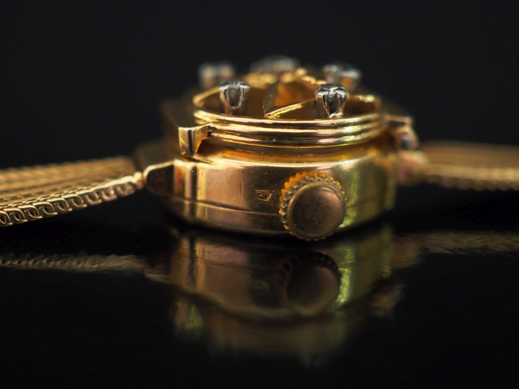 VERBEL, Montre bracelet de dame aveugle, boitier et bracelet en or jaune. Cadran rond agrémenté d'un couvercle ajouré et serti de petits diamants, à décor de fleurs. Index bâtons pour les heures. Bracelet souple, maille plate. Mouvement mécanique à remontage manuel. Long. 16 cm Poids tel. 19,54 g (un petit accroc au bracelet, petits rayures d'usage au revers, deux petits chocs au verre)