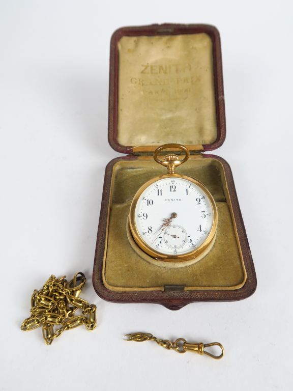 ZENITH. Montre de gousset en or Poids tel. 78 g On y joint une partie de giletière en or et une giletière en métal doré. Poids. 2 g
