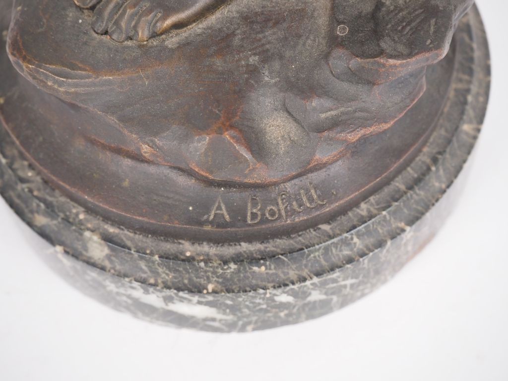A. BOFFILL. "David" Sculpture en bronze à patine brune. H. 41,5 cm petit socle en marbre vert H. totale : 45 cm