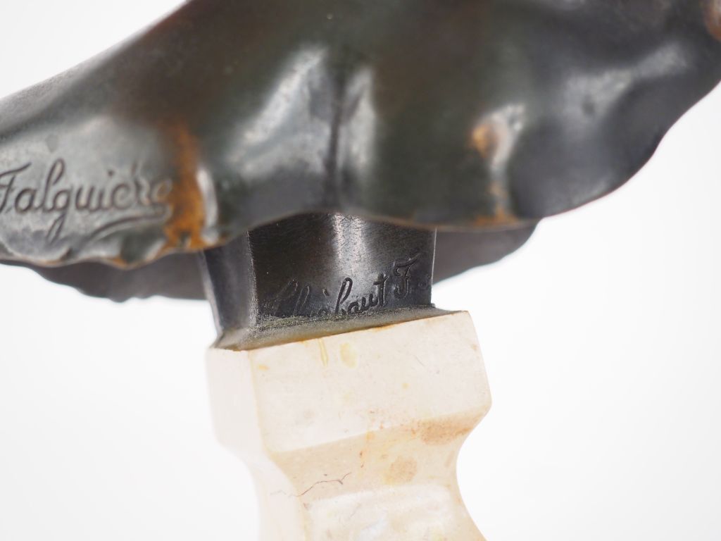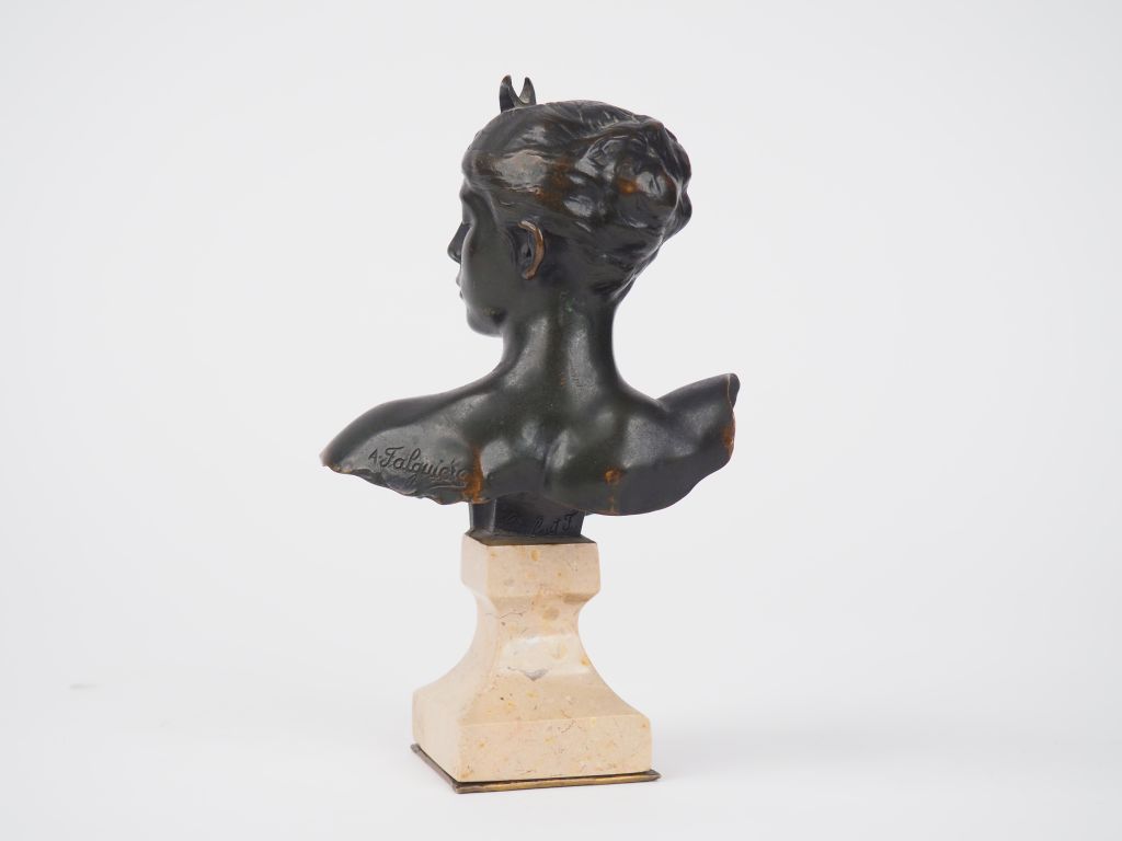 A. FALGUIÈRE. 'Buste de Diane chasseresse'. Sculpture en bronze sur un socle en marbre brun. Signée. Fonte THIEBAULT Frères. H. : 16,5 cm.