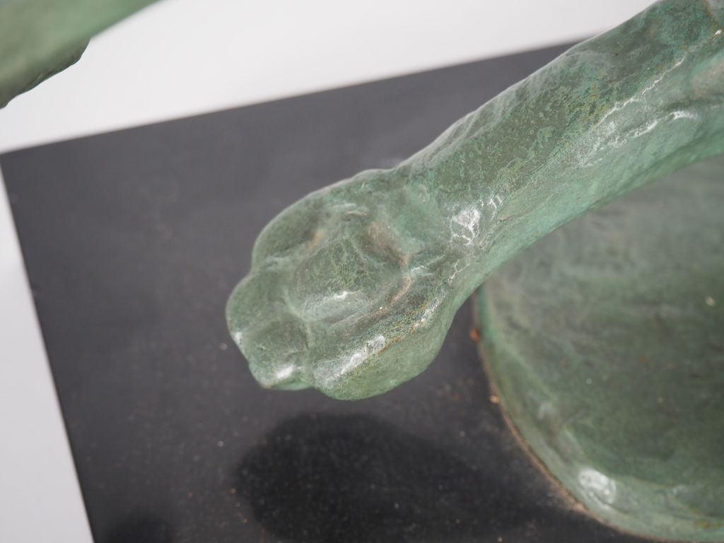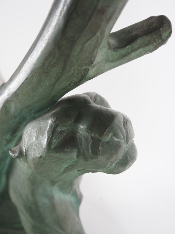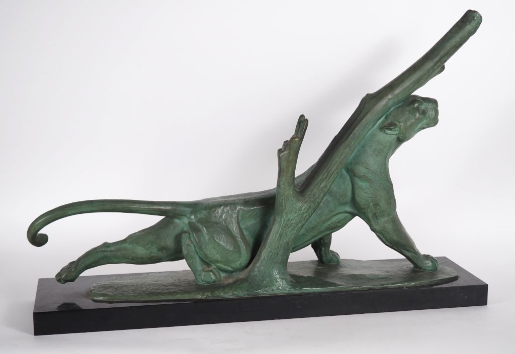 André Vincent BECQUEREL (1893-1981) « Panthère se frottant à un arbre ». Épreuve en bronze à patine vert antique nuancée sur socle quadrangulaire en pierre noire. Signé AV Becquerel dans le bronze. (petite restauration à la base de la queue ?) Historique : André Vincent Becquerel, élève d’Hector Lemaire dans un premier temps puis de Prosper Lecourtier dans un second temps, exposera régulièrement au Salon des Artistes Français entre 1914 et 1922. Dim. 51 x 76 cm Expert : Amélie MARCILHAC