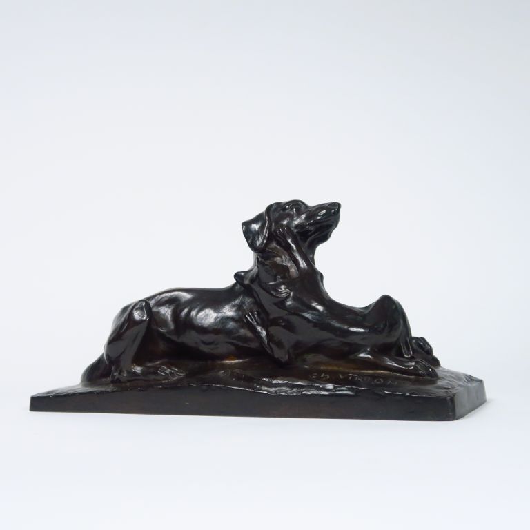 Lot de CH. VIRION. "Chien et chat". Groupe en bronze sculpté à patine brune, au prix de 200 à 300 € en vente aux enchères par l'hôtel des ventes Primardeco
