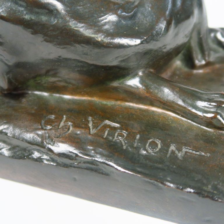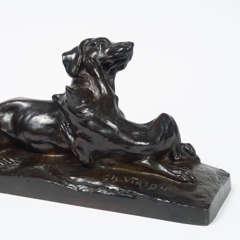 CH. VIRION. "Chien et chat". Groupe en bronze sculpté à patine brune, signé. Dim. : 34 x 17 cm.