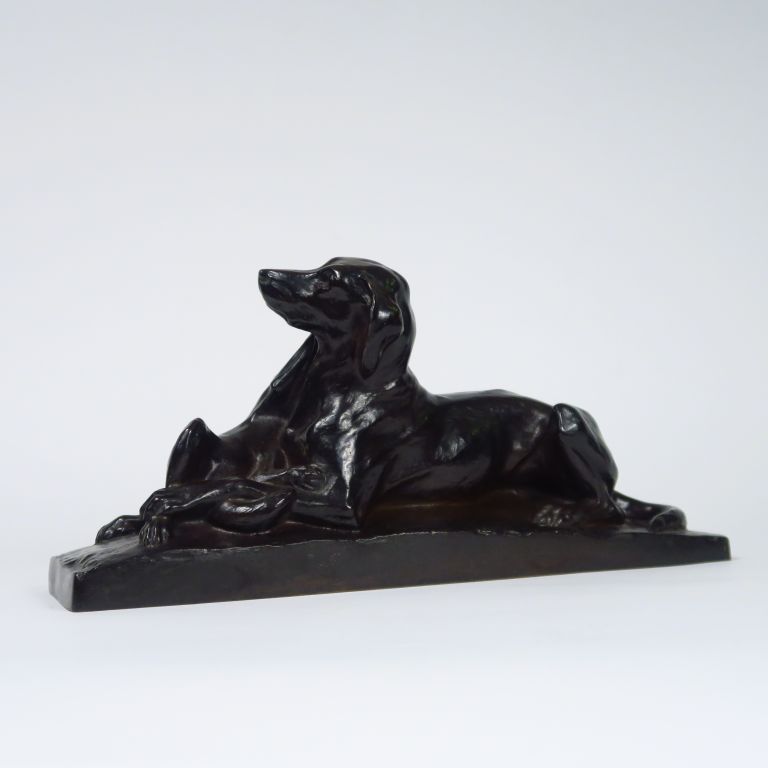 CH. VIRION. "Chien et chat". Groupe en bronze sculpté à patine brune, ...