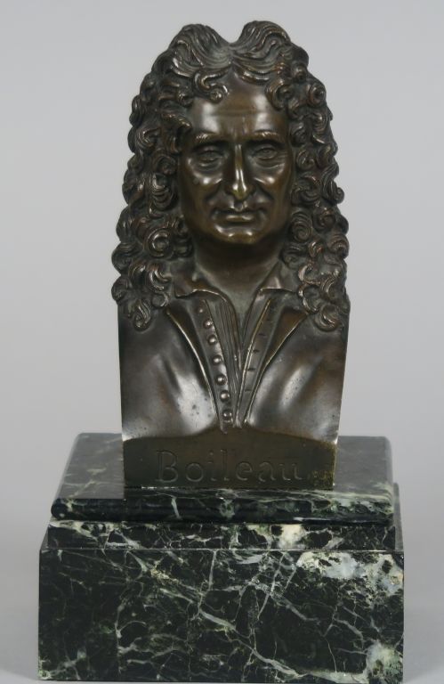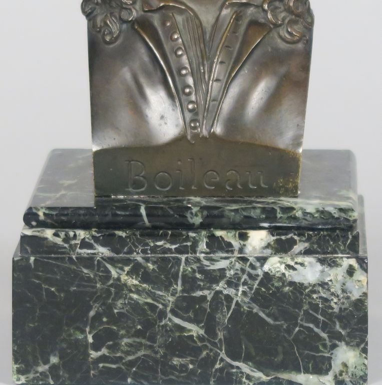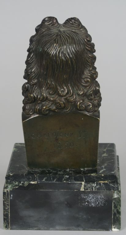 CHARDIGNY "Portrait de Boileau" Sujet en bronze à patine brune. Signé, titré et daté 1850. Socle en marbre vert. H. sans le socle : 13 cm H. totale : 18 cm