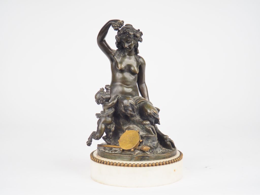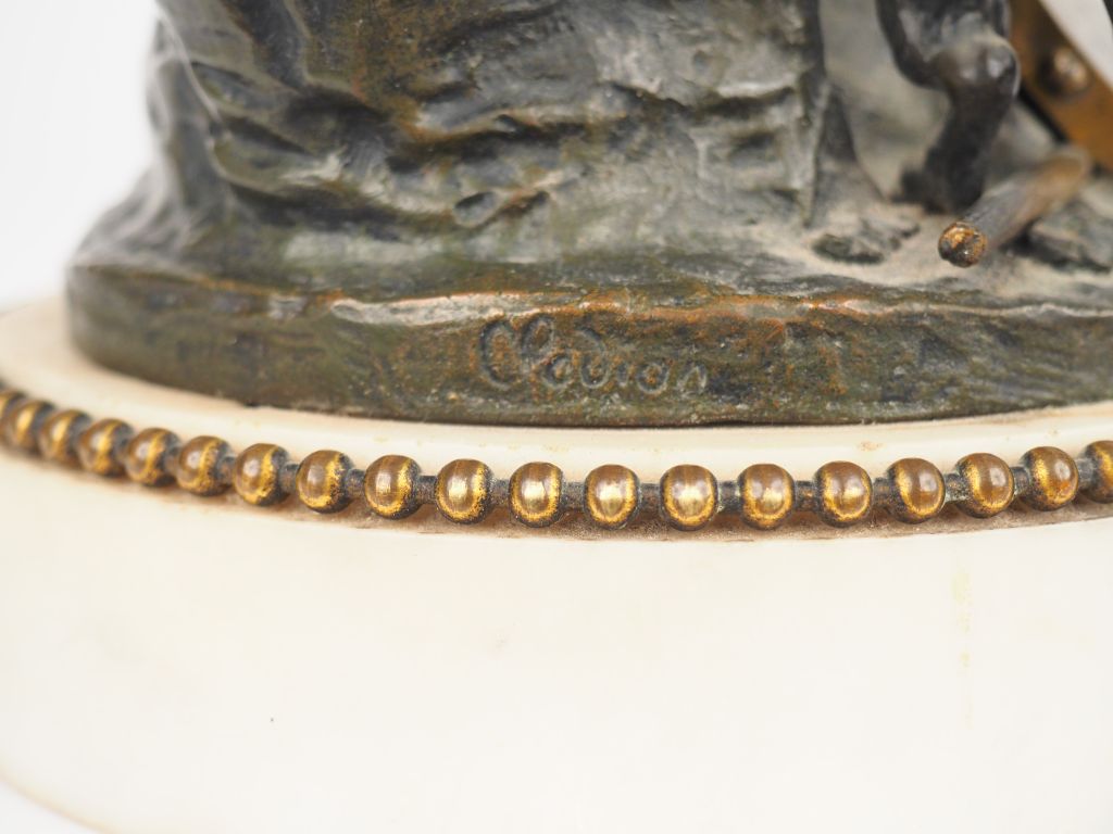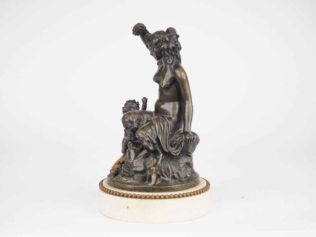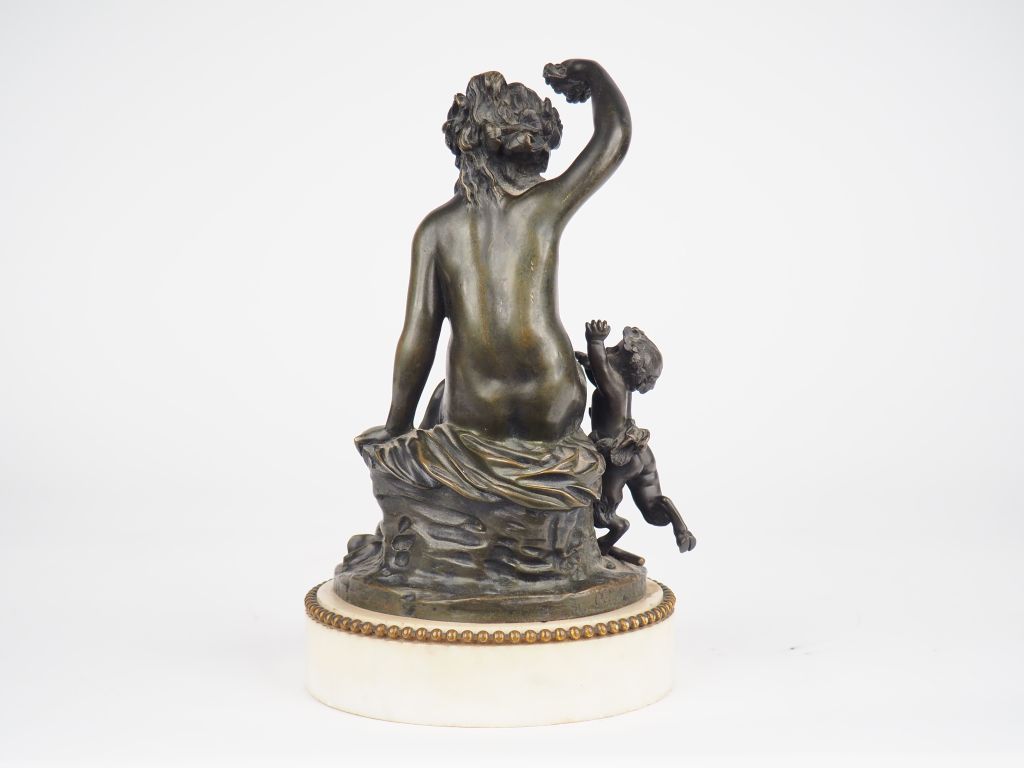 CLODION (d'après). "Faunes". Groupe en bronze à double patine, sur son socle en marbre blanc. Signé. Dim. 25,5 x 14,5 cm.