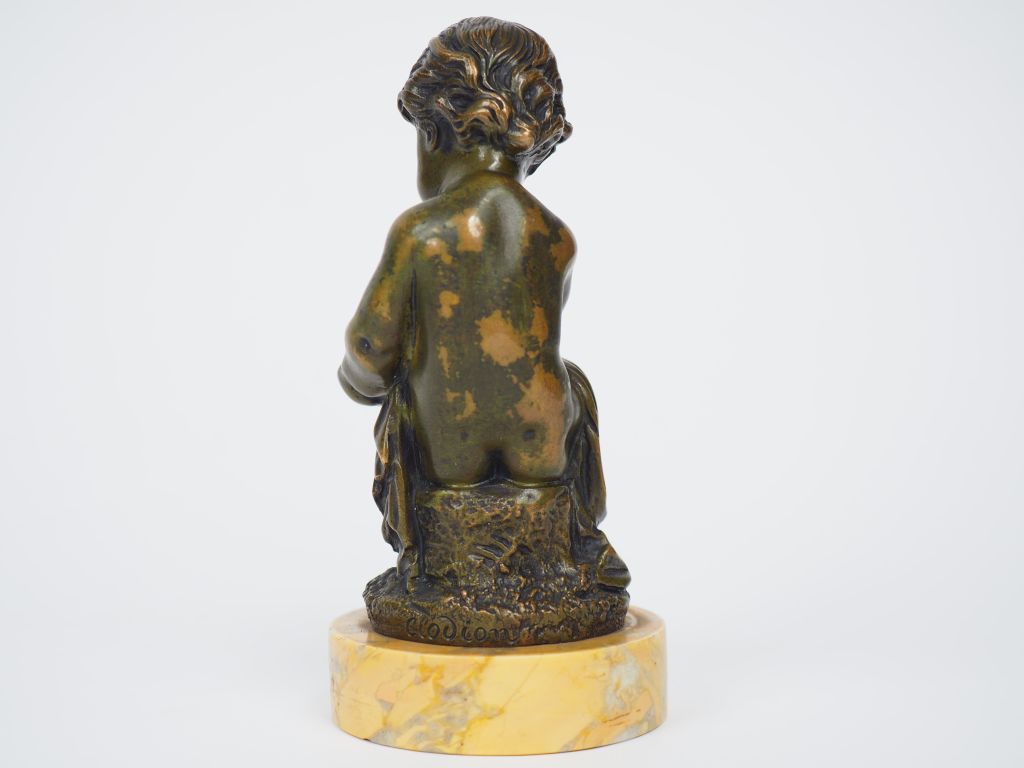 CLODION (d'après) "L'amour au nid" Sujet en bronze à patine verte. Petit socle en marbre clair. Signé. H. 14,5 cm