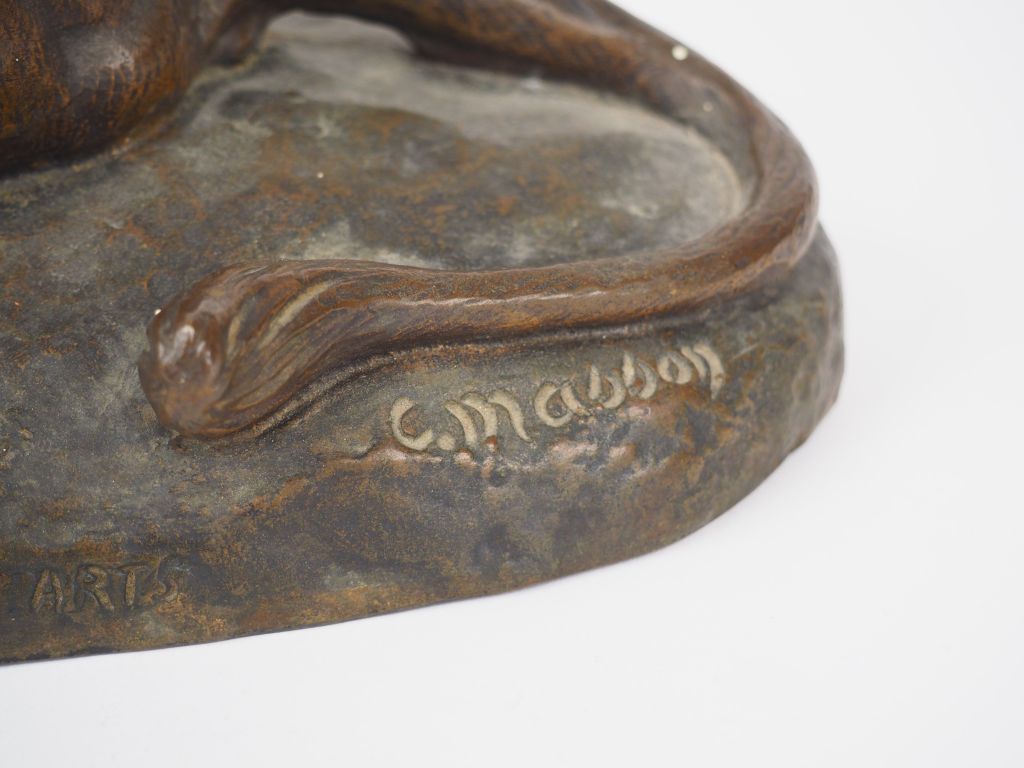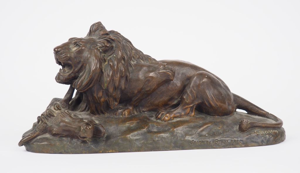 Clovis Edmond MASSON. 'Lion dévorant un buffle'. Sculpture en bronze à patine brune, signée. Dim. : 37 x 18 cm.