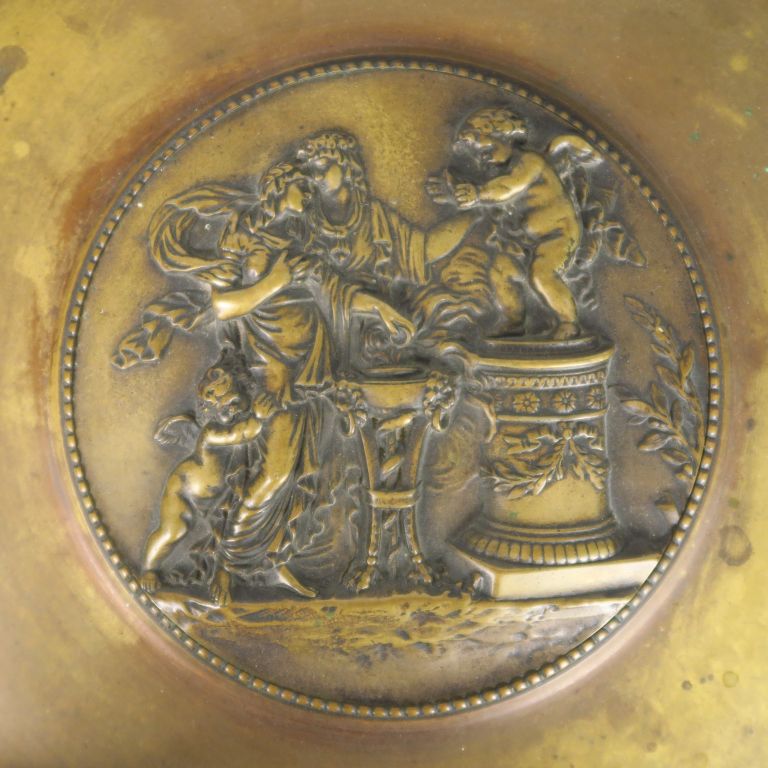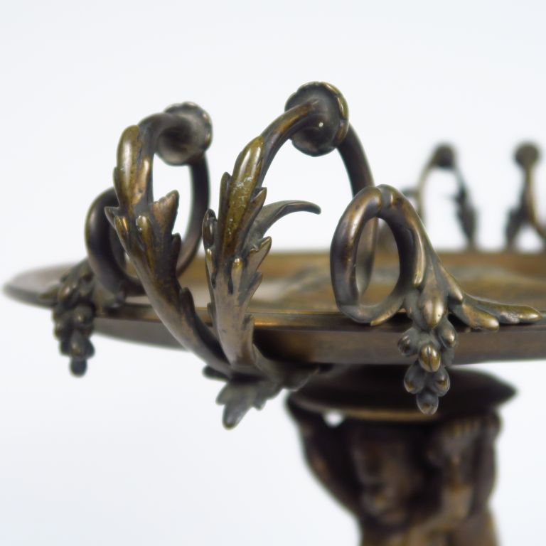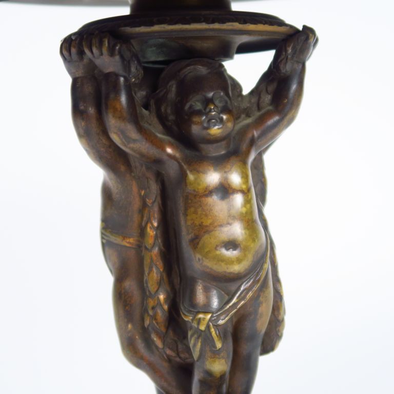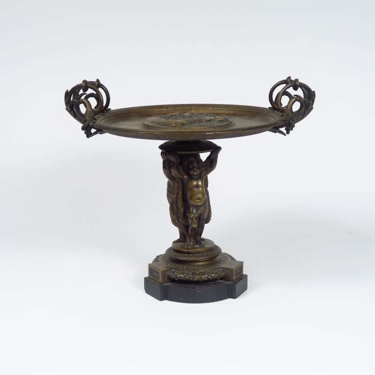 Coupe sur pied XIXème en bronze, à décor d'amours, de guirlandes et de frise sur un socle en marbre noir. H. : 31 cm. (égrenures)
