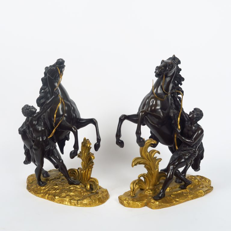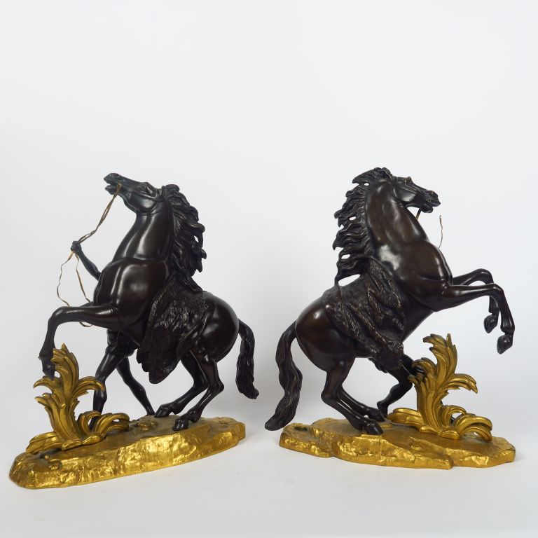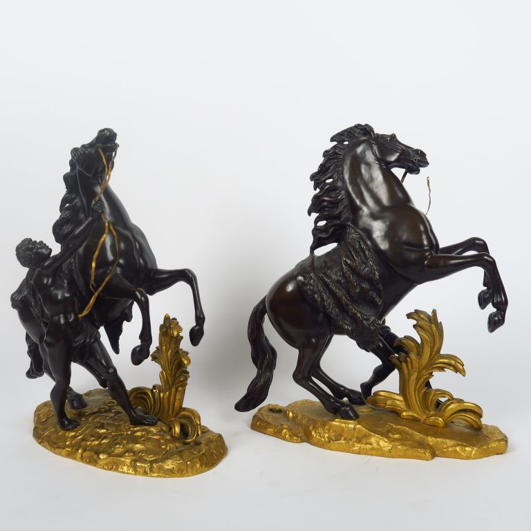 COUSTOU. "Les chevaux de Marly". Paire de sculptures en bronze à patine brune et dorée. Signées. Dim. 36 x 33 cm