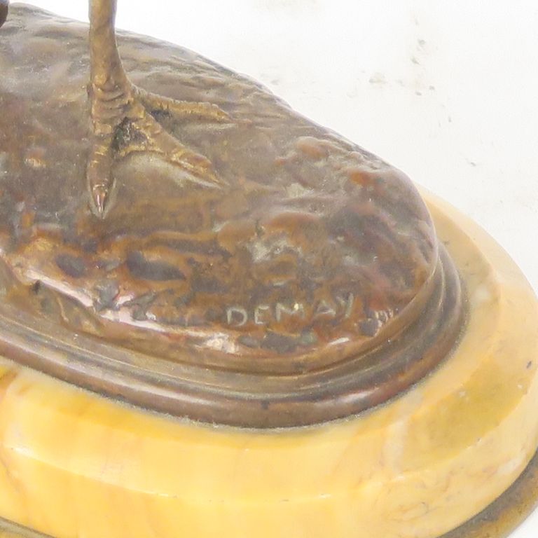 DEMAY. 'le héron". Sculpture en bronze à patine médaille, sur un socle en onyx. Signée. H. totale : 15,5 cm. (accident sur une patte)
