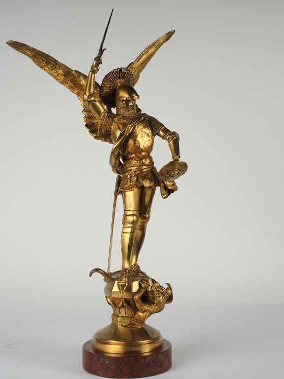 E. FREMIET. "Saint Michel terrassant le dragon". Sculpture en bronze doré, fonte Barbedienne, signée. H. 61,5 cm