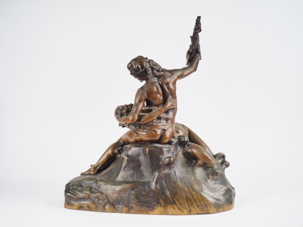 E. HANNAUX. "Le poète et la sirène". Groupe en bronze à patine verte. Signé. Dim. 57 x 52 x 27 cm.