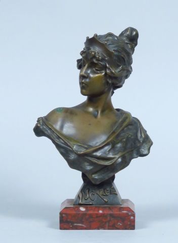 E. VILLANIS "Portrait de Lucrèce en buste". Sculpture en bronze à patine brune, socle marbre rouge. Signée. H. avec le socle : 24 cm