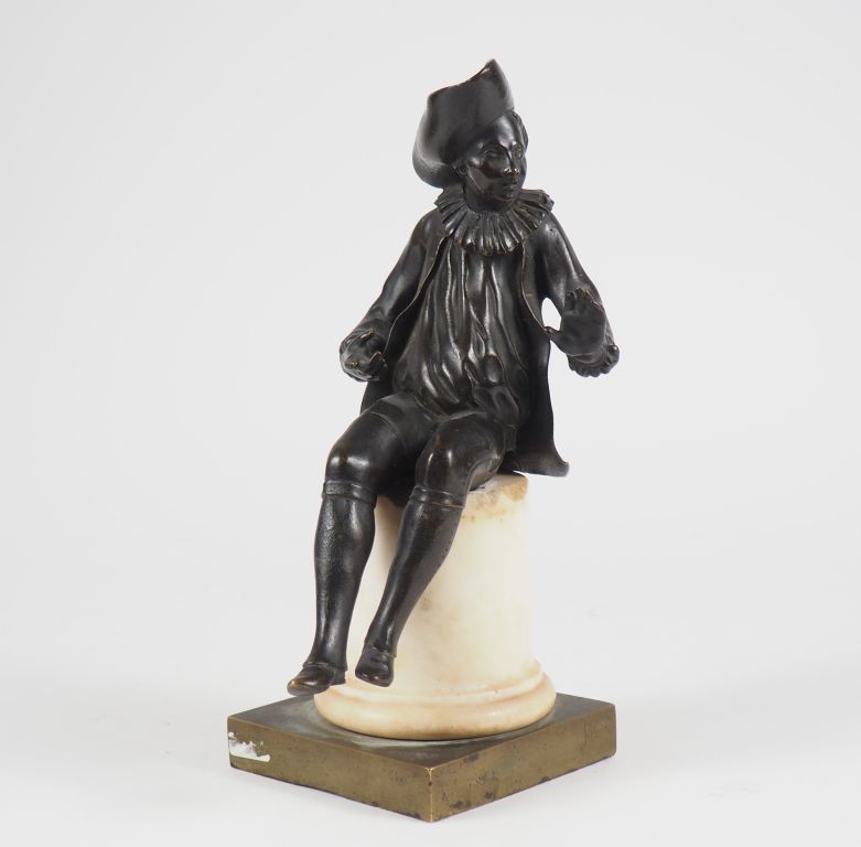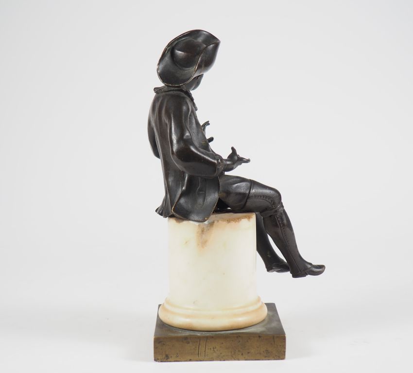 Ecole française XIXème. "personnage en habit du XVIIIème" Sculpture en bronze à patine brune et albatre. H. 24,5 cm (petites égrenures à la colonne)