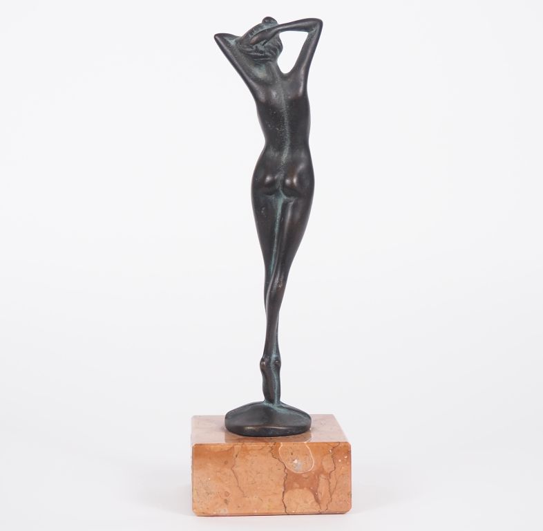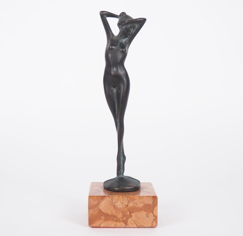 Ecole française Xxème. "Jeune femme nue" Sculpture en bronze à patine brune sur un socle en marbre. H. 22 cm H. totale : 27 cm