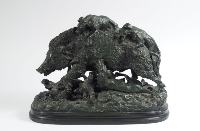 FRATIN 'Sanglier attaqué par des chiens'. Groupe en bronze à patine ve...