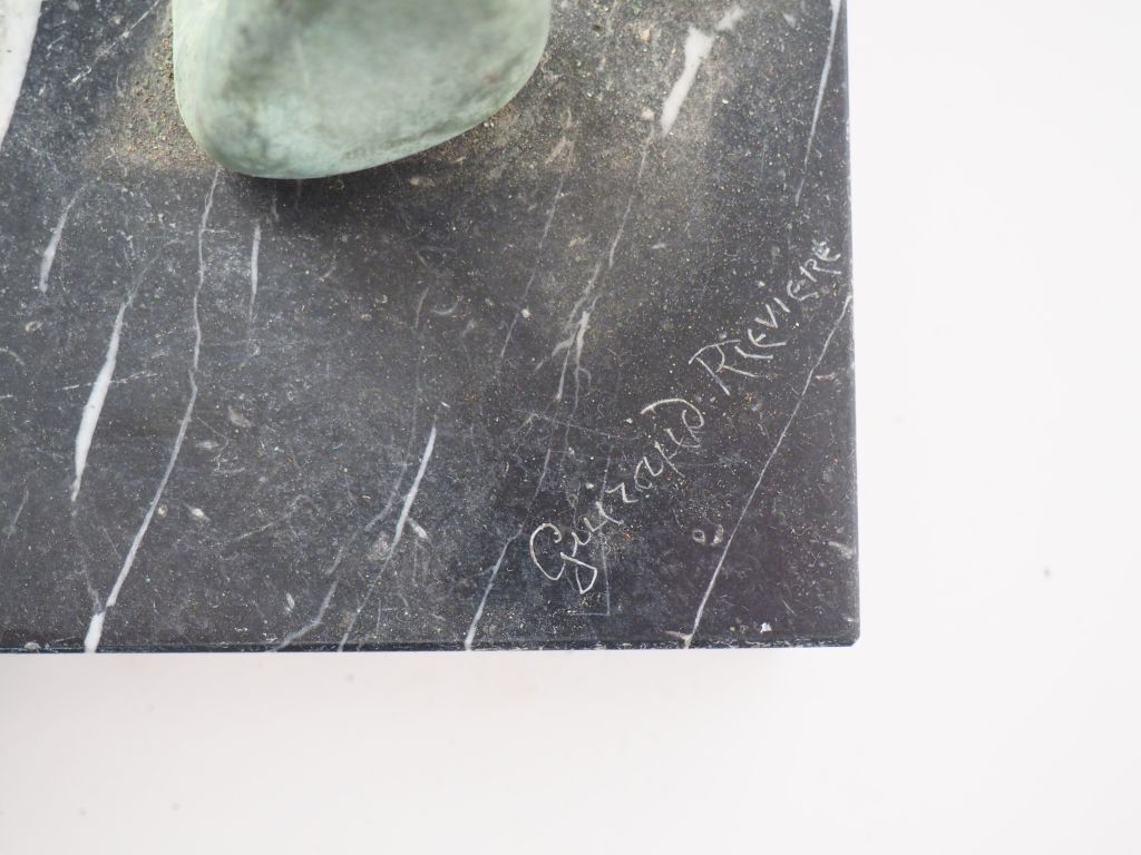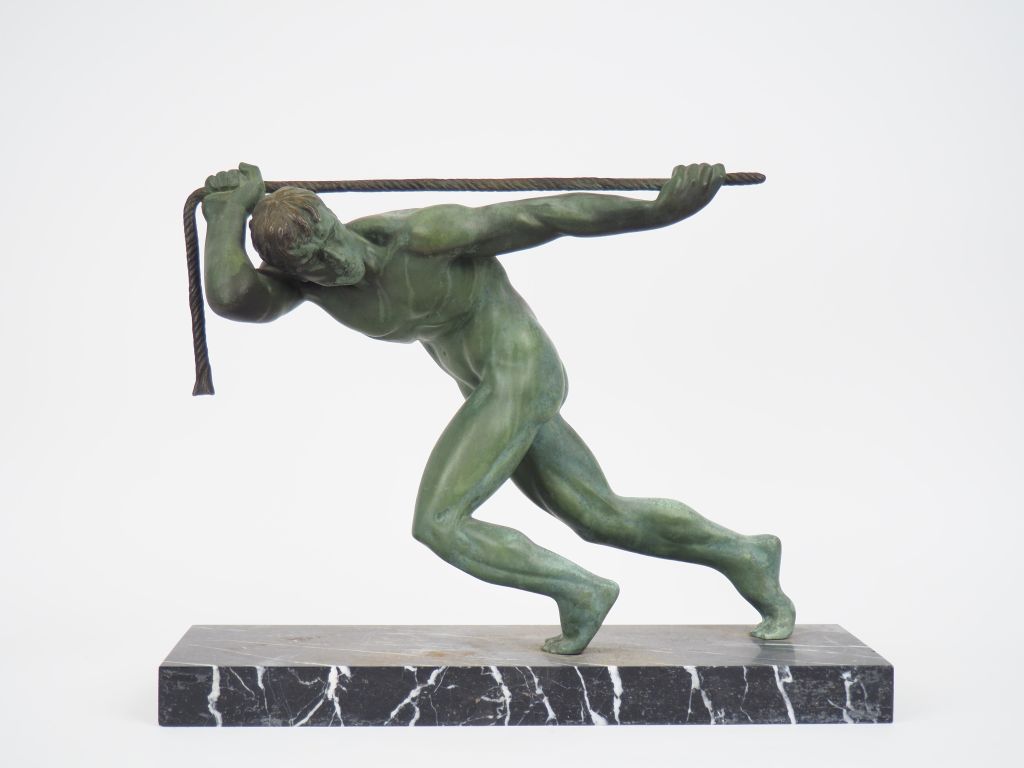 GUIRAUD-RIVIERE. "La force". Sculpture en bronze à patine verte sur un socle en marbre noir Signée sur le socle. H. avec le socle : 38 x 50 x 16,5 cm