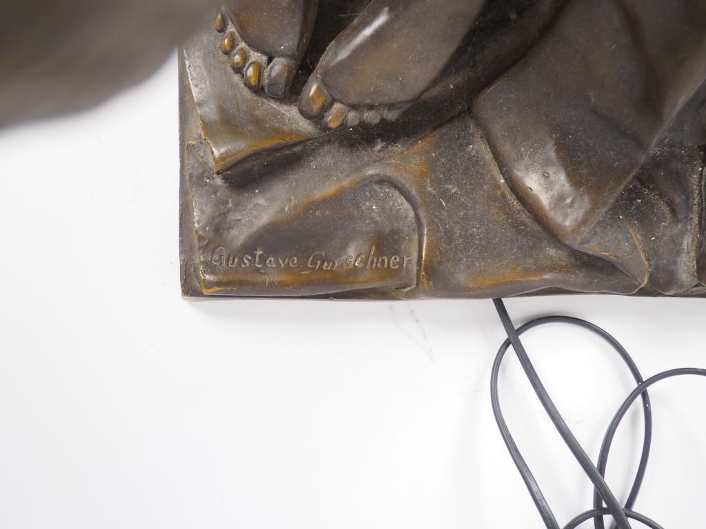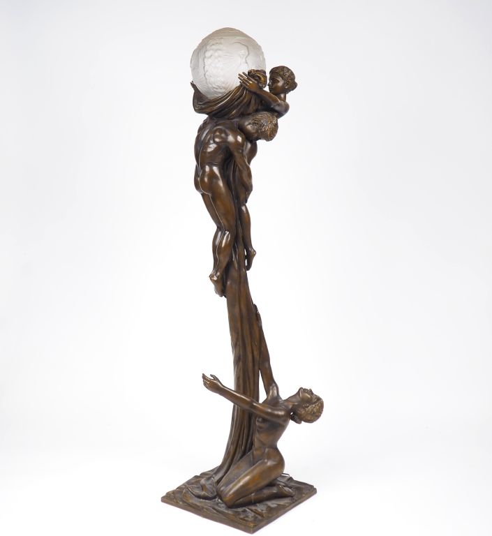 Gustav GURSCHNER. "Elévation". Grand et spectaculaire lampadaire en bronze à patine verte, abat jour en verre moulé, à décor d'oiseaux signé Muller Frères. H. avec abat jour : 160 cm.