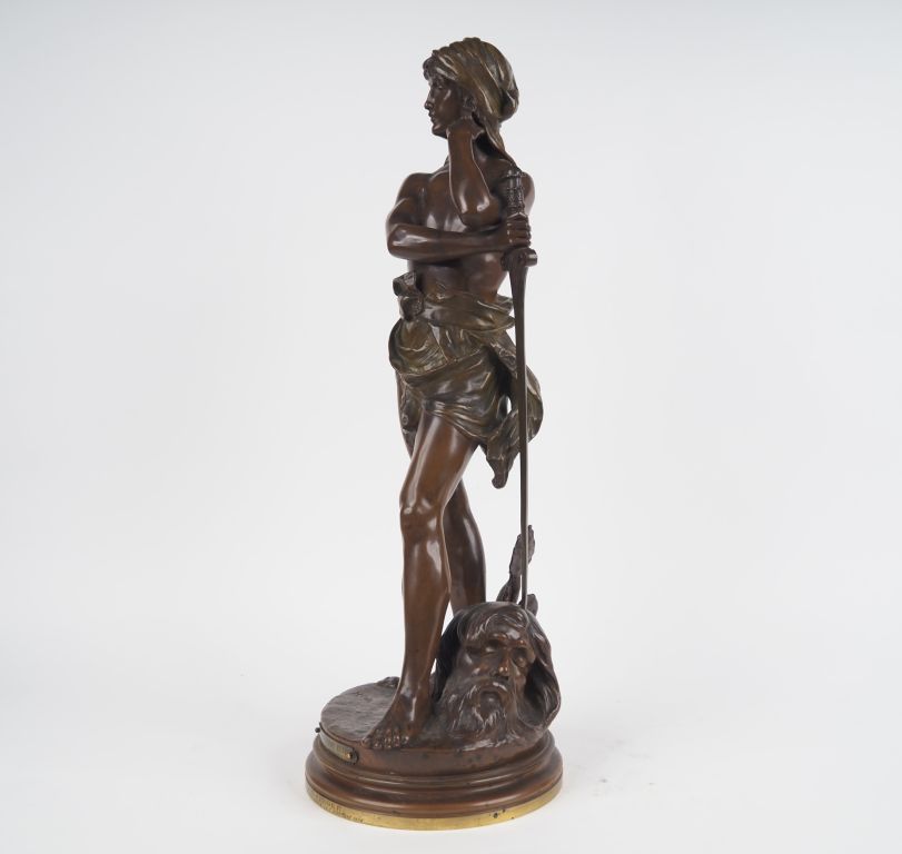 Henri PLE. "David vainqueur" Sculpture en bronze à patine médaille et verte Signée H. 64 cm Société des bronzes de Paris, numérotée 8204