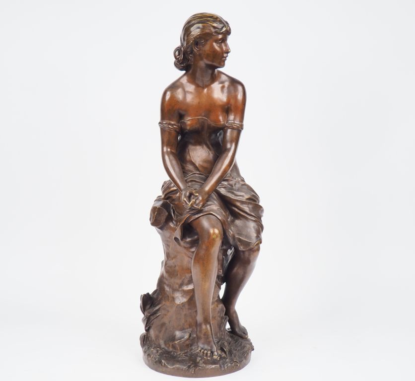 Hippolyte MOREAU. "Jeune fille pensive". Sculpture en bronze à patine brune. H. 69 cm. (Usures de patine).