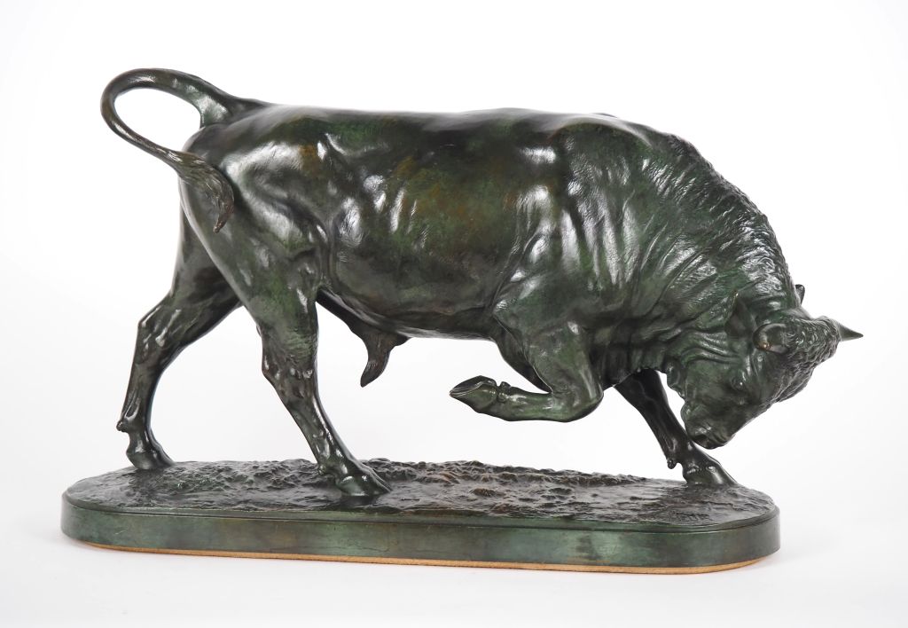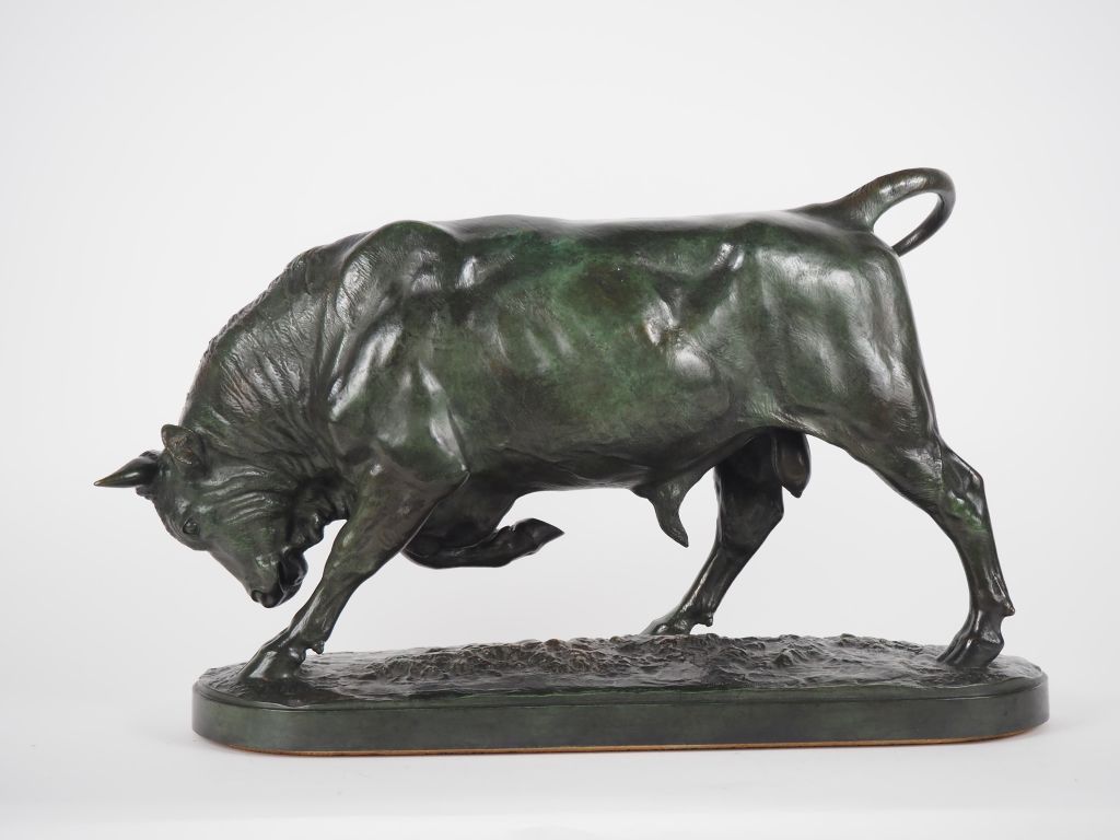 Lot de Isidore BONHEUR. "Taureau chargeant" Grand bronze à patine verte Sign au prix de 800 à 1200 € en vente aux enchères par l'hôtel des ventes Primardeco