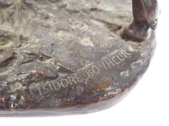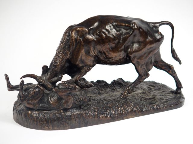 Isidore Louis BONHEUR "Vache combattant un loup". Bronze à patine brune. Signé. Dim. : 37 x 20 x 16.5 cm
