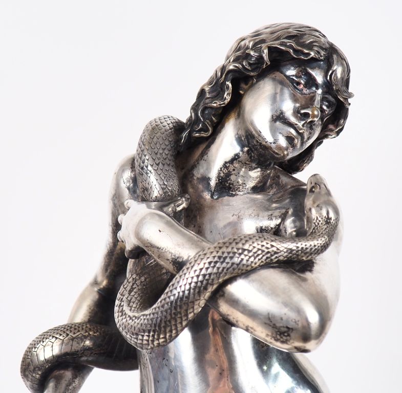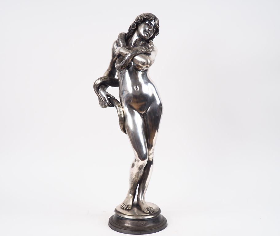 J. ANTOINE IDRAC. "Salammbô" Sculpture en bronze argenté, fonte Thiebaut Frères fondeur à Paris Signée. H. 72 cm