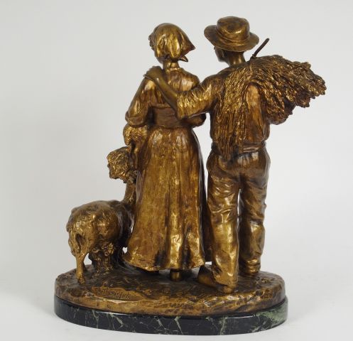 J. d’ASTE. Sculpture en bronze à patine dorée, "Couple de paysans et leurs animaux". Sur un socle en marbre vert de mer. H. : 37,5 cm. Signé.