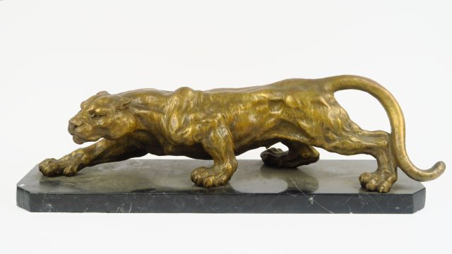LAROCHE "Lionne à l'affut". Sculpture en bronze à patine médaille, socle en marbre noir. Dim. : 63 x 19 x