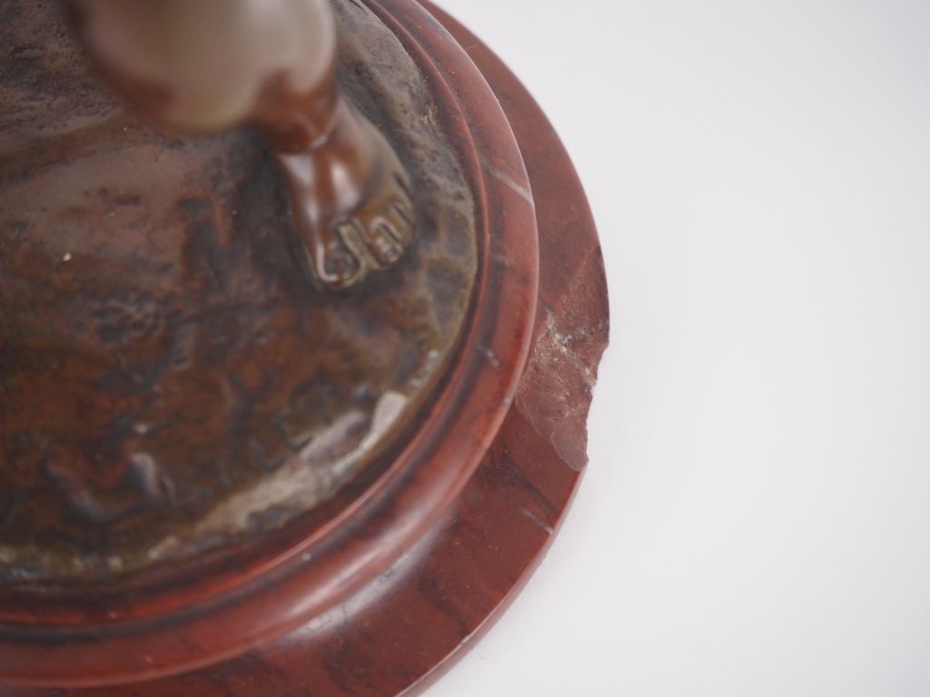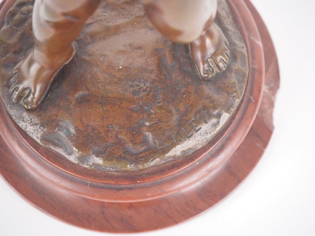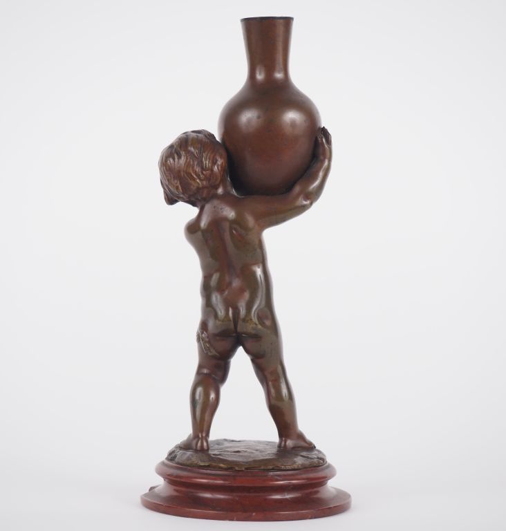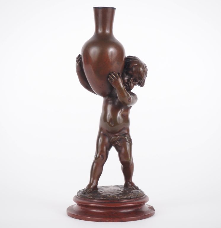 Louis KLEY. "Amour portant un vase" Sculpture en bronze à patine médaille sur un socle en marbre rouge. H. totale. 20,5 cm (socle accidenté)