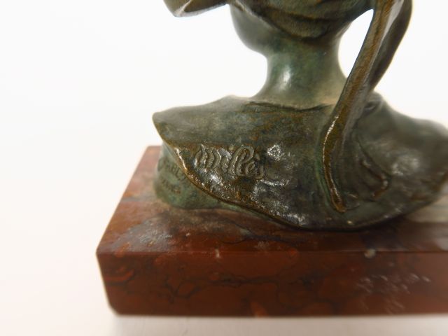 MILLES "Petite bretonne" Sujet en bronze à patine verte, socle en marbre rouge. Signé. H. avec le socle : 8 cm