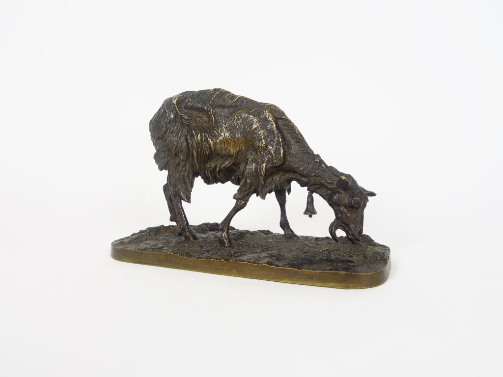 P.J. MENE. "Chèvre broutant". Sculpture en bronze à patine brune. Signée. 12,5 x 24 cm (queue manquante).
