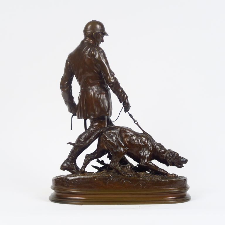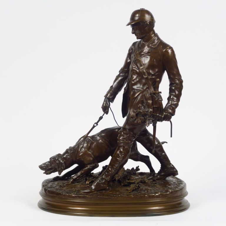 P.J. MENE. "Le valet de limier". Groupe en bronze à patine médaille, signé et daté 1879. Dim. : 48 x 38 x 21.5 cm
