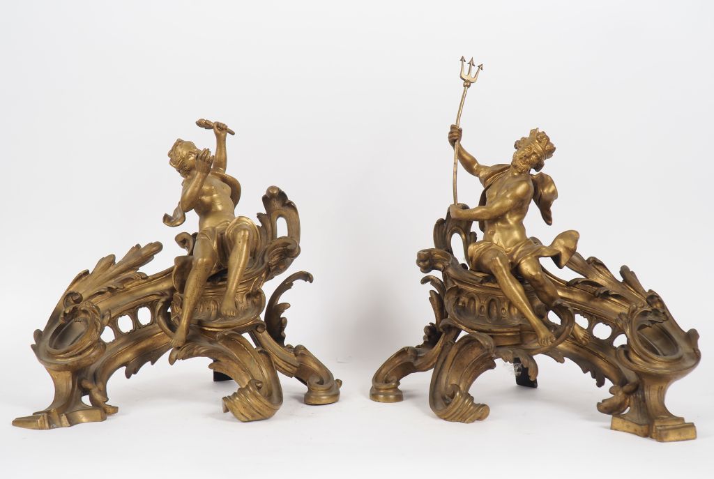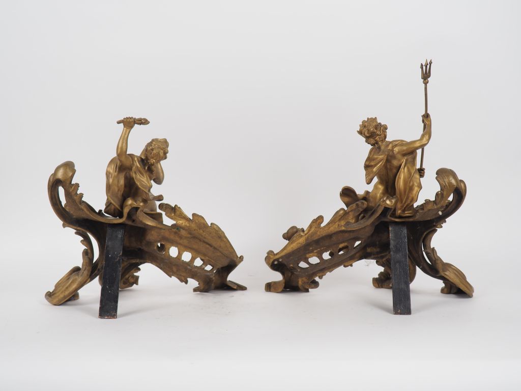Paire de feux de cheminée de style Rocaille en bronze figurant Neptune et Amphitrite. H. Neptune : 45,5 cm H. Amphitrite : 38 cm (portent un numéro et une trace de signature)