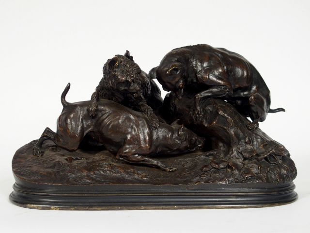 PJ. MENE, "Les trois chiens de chasse au terrier". Groupe en bronze à patine brune. H. : 22 cm, Larg. : 35 cm. Signé.