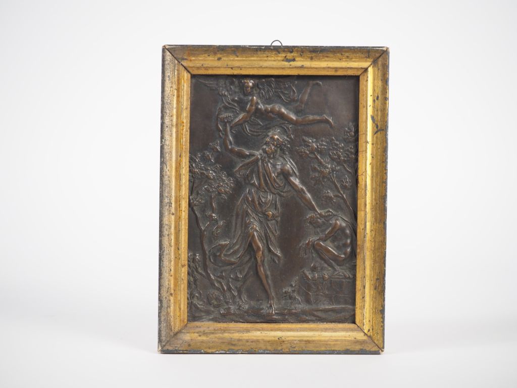 Plaque XIXème d'après Annibal Fontana en bronze à patine brune, "le sacrifice d'Isaac". Dim. 17 x 12,5 cm.