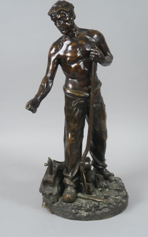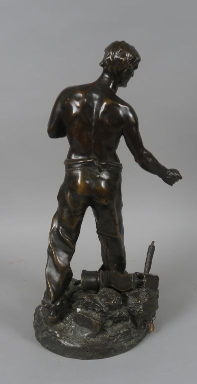 ROUSSEAU « Le mineur » Sculpture en bronze à patine brune. Signée. H. 54 cm (incomplet)