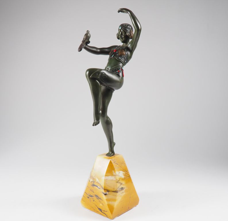 S. LIPCHYTZ. "Danseuse à la palombe" Sujet Art Déco en bronze à patine verte et rehauts d'émail sur un socle à pans coupés en marbre jaune de Sienne. H. du sujet : 30 cm H. totale : 41 cm