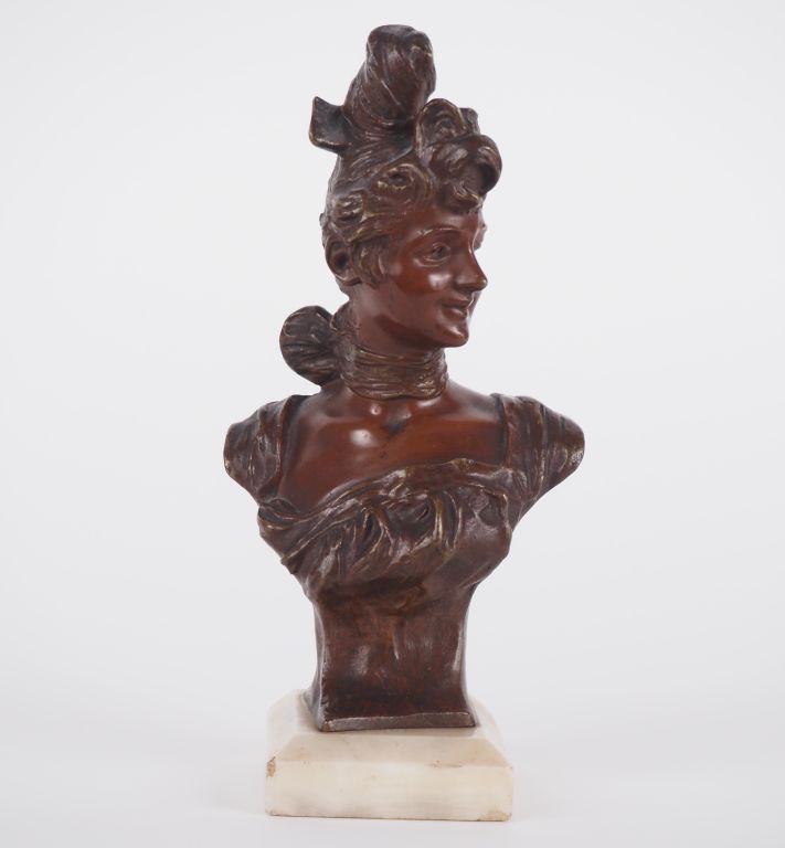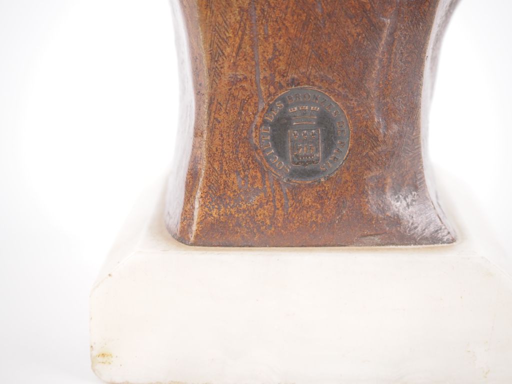 VANDERSTRAETEN. "jeune fille en buste" Sujet en bronze à patine médaille sur un socle en onyx blanc H. totale : 20,5 cm
