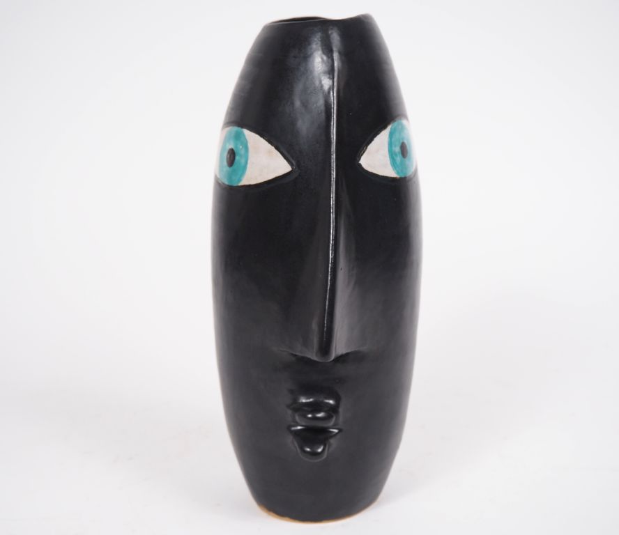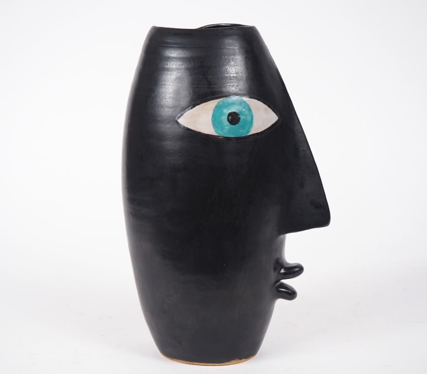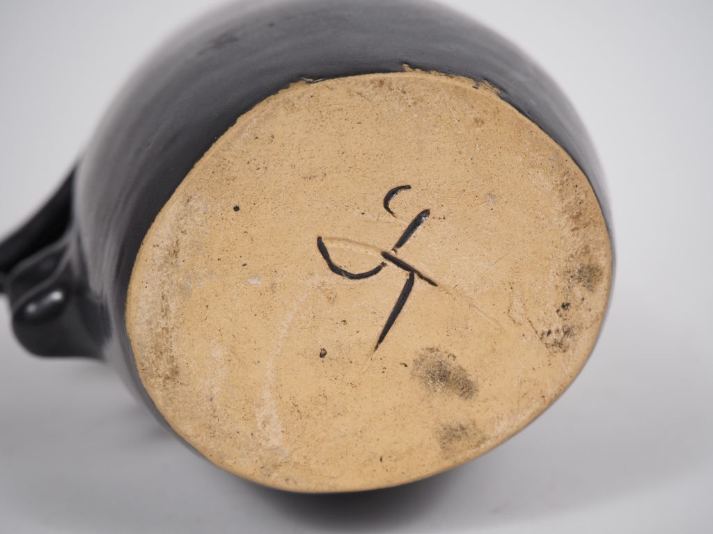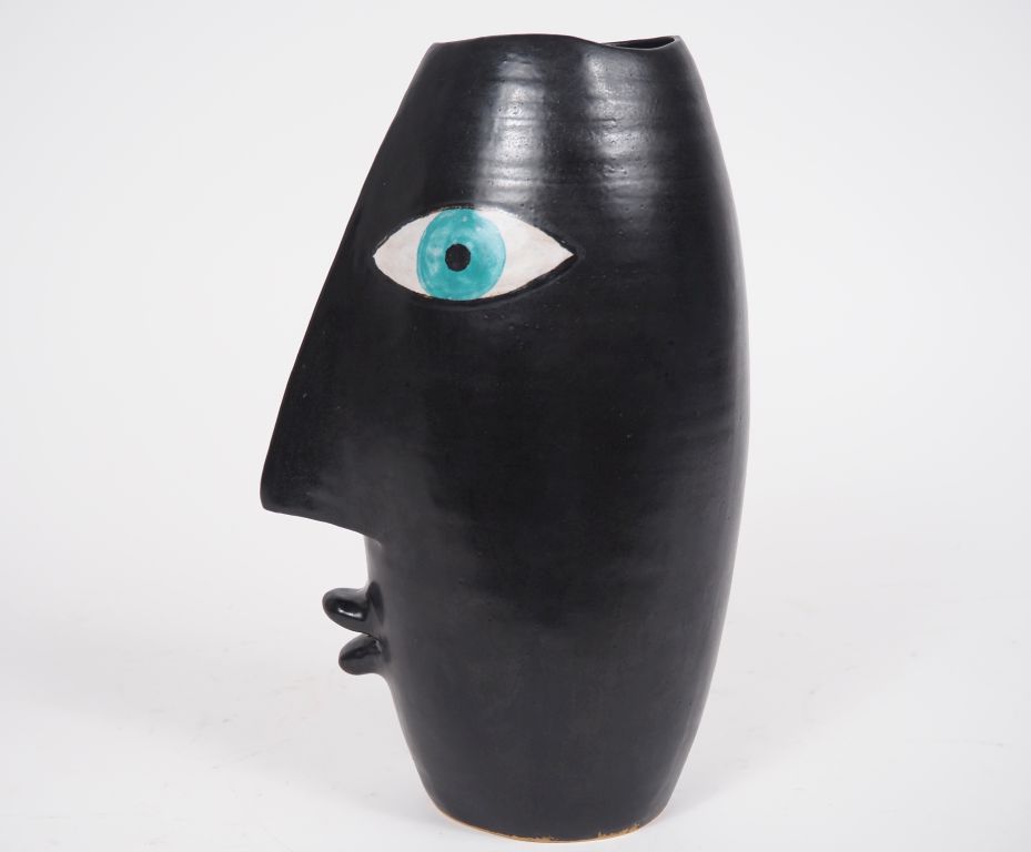 Ecole française XXème. "Pichet visage" en céramique polychrome sur fond noir. Signé. H. 26 cm.