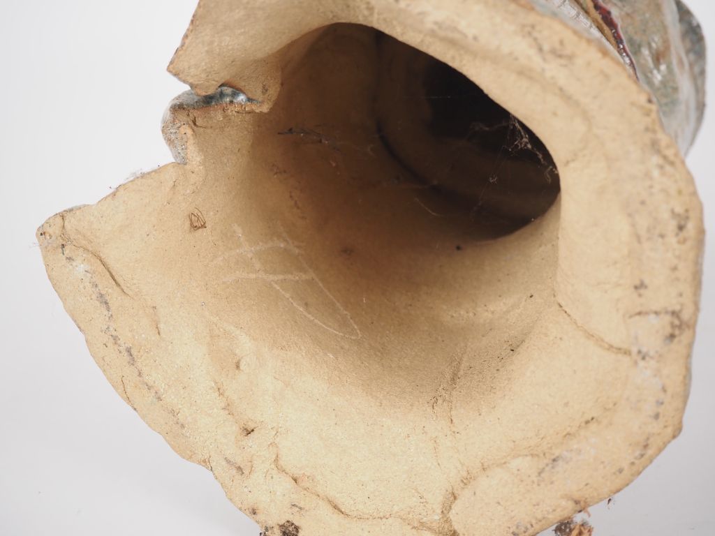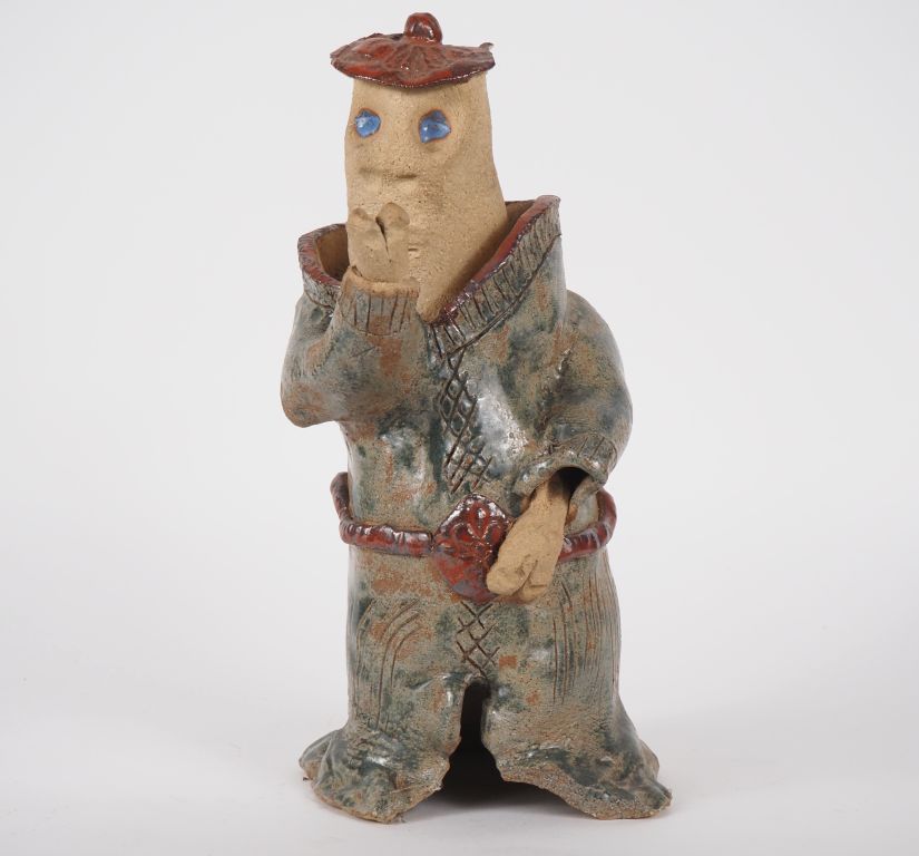 Ecole moderne. "Personnage au bras levé". Sculpture en terre vernissée polychrome. Signée. H. 35 cm. (Egrenures).