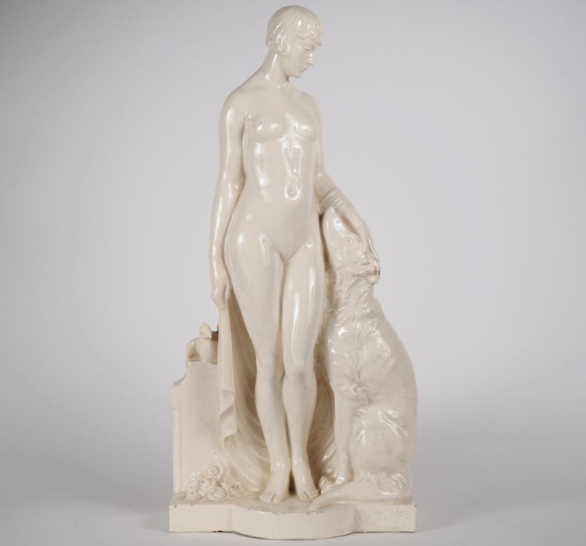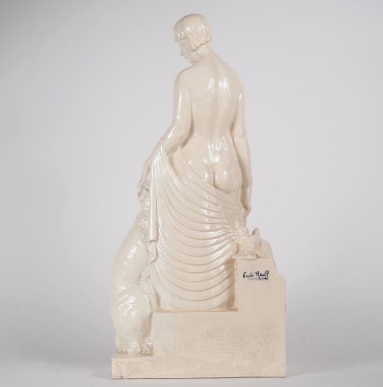 Emile ROUP. "Jeune fille à la colombe et au chien". Sculpture en céramique craquelée. Signée. H. 57 cm. (Egrenures).